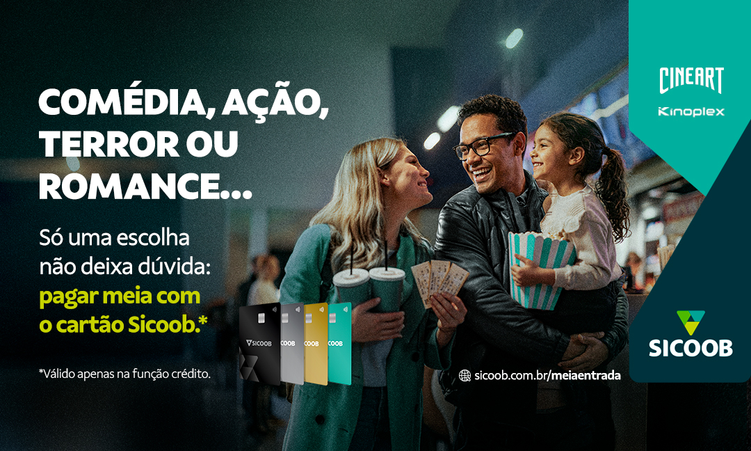 - Na compra on-line: acesse o site Kinoplex ou Cineart, escolha o filme, a data e o horário. No pagamento, utilize o cartão do Sicoob para garantir o desconto.